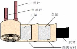 固態(tài)鋁電容器的結(jié)構(gòu)為:正箔和負(fù)箔分別與正、負(fù)導(dǎo)針相連,兩者由隔離材料隔開(kāi)并重迭卷繞在一起,并由膠帶固定,其中,隔離材料為疏松多孔結(jié)構(gòu),其間填充有導(dǎo)電高分子聚合物;該卷繞結(jié)構(gòu)被鋁外殼和橡膠蓋密封,導(dǎo)針穿過(guò)橡膠蓋與外界相通。